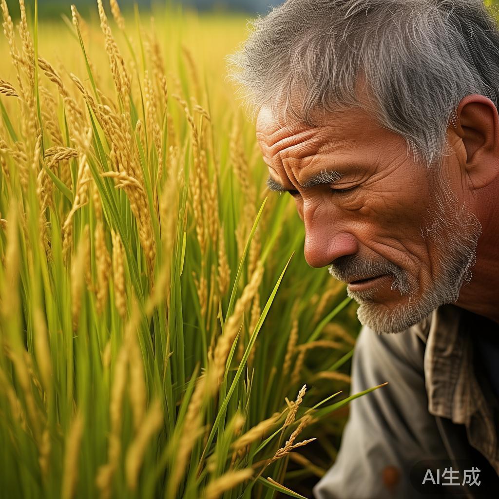 而在不远处,田野间的稻穗轻轻摇曳,一阵微风拂过,如同涓涓细流般温柔。这时,农民伯伯弯下腰,认真地查看着每一株禾苗,满脸布满皱纹但却透出满足的神情。他们的辛勤付出,铸成了大地的丰盈,映衬出一种质朴而深邃的美。